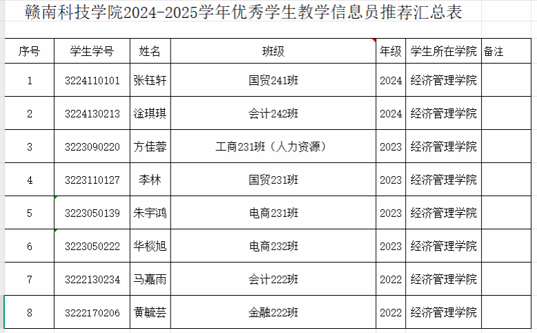根据《赣科院教字(2024)4号关于印发《澳门十大网投正规官网平台教学信息员制度(试行)》的通知》要求,经学生个人申请、学院审核等程序,拟推荐国贸241班张钰轩等8位同学为优秀学生教学信息员初评人选,现将初评人选的相关情况公示如下(按年级学号排序):