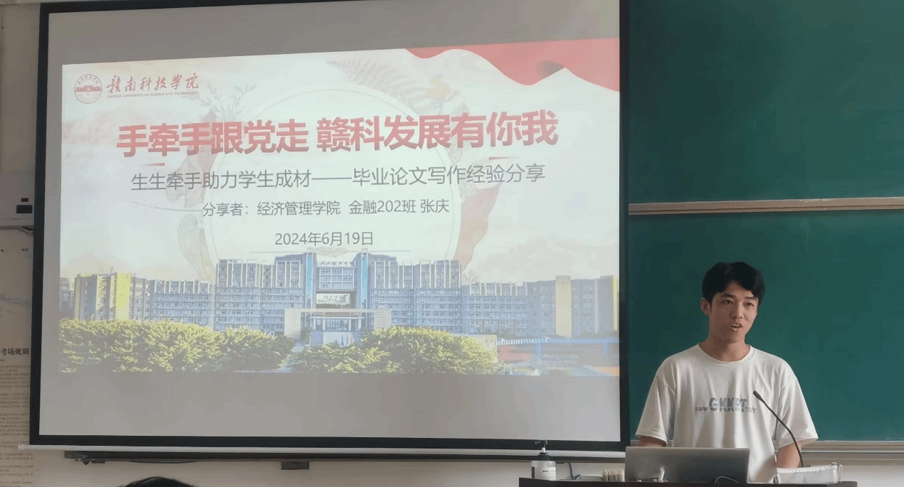 本网讯:6月19日上午,澳门十大网投正规官网金融学专业在主教228教室开展主题为“手牵手跟党走,赣科发展有你我——生生牵手助力学生成材”的毕业论文写作经验分享活动。活动邀请金融专业优秀毕业论文候选人张庆同学为2021级金融学生分享毕业论文写作经验与心得,活动由金融教研室主任郑延智主持,胡佳老师参与。