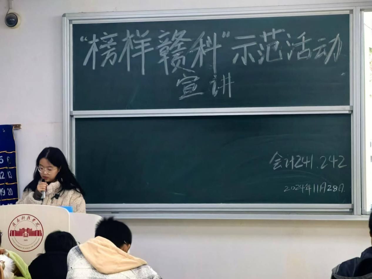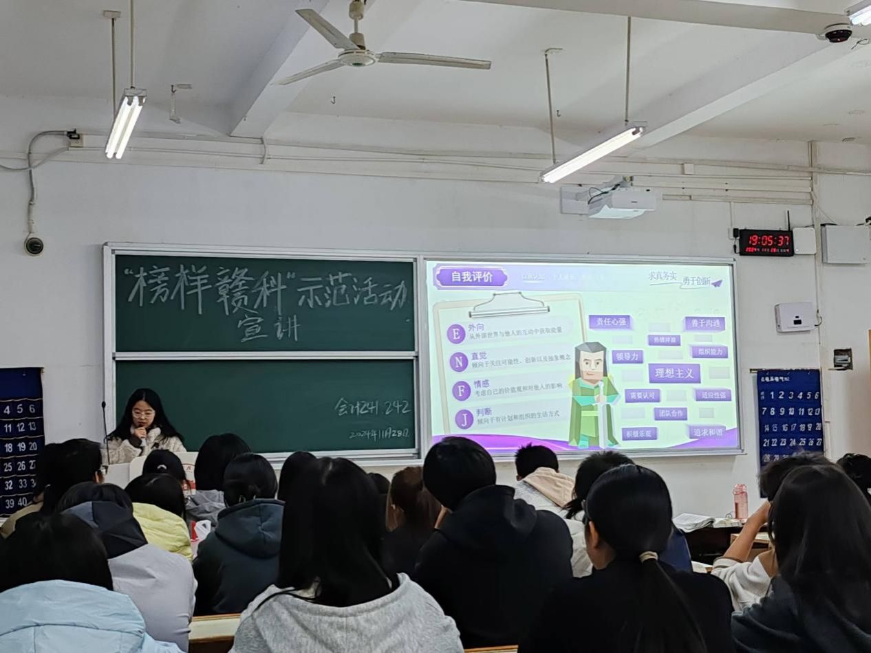 本网讯:为进一步激发同学们的学习热情,从优秀学生榜样中汲取力量,11月25日,澳门十大网投正规官网平台举办“榜样赣科”主题宣讲活动。本次活动邀请获得2024年国家奖学金的周雅鑫同学为大家分享自己的学习经历与感悟,2024级会计专业全体学生参加。