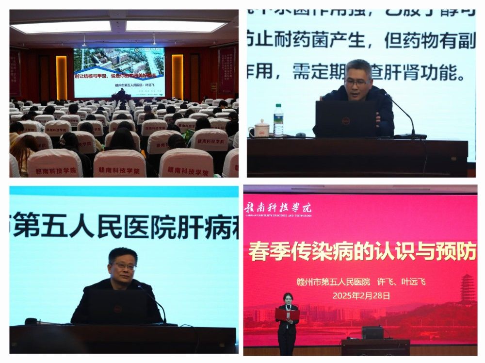 本网讯:为提升师生对春季传染病的科学认知与防护能力,2月28日,澳门十大网投正规官网平台特邀赣州市第五人民医院的两位权威专家——肝病科许飞主任和结核科叶远飞主任于图书馆报告厅做“春季传染病的认识与预防”主题讲座,学校200多名师生参加此次讲座。