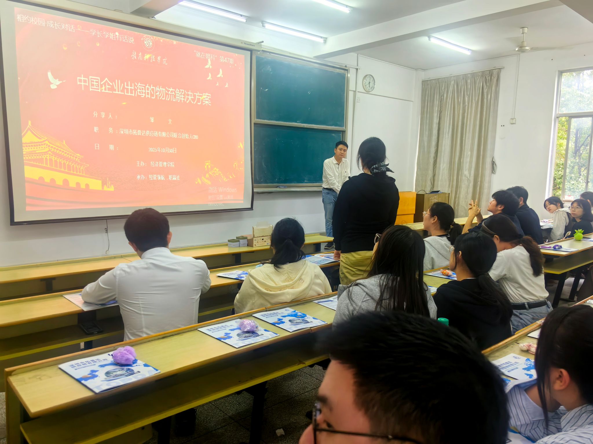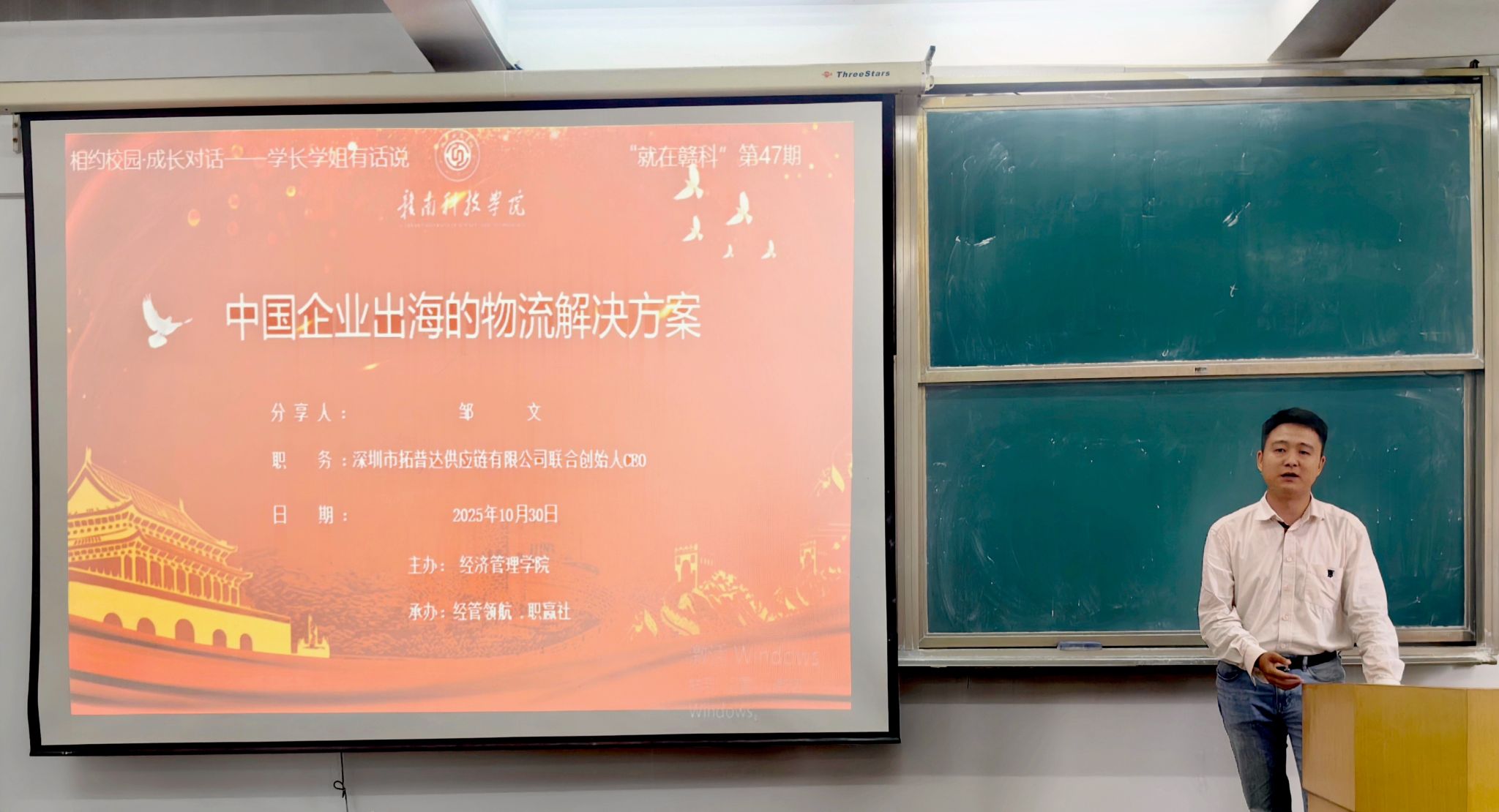 本网讯:10月30日下午,澳门十大网投正规官网平台特邀2009届国际经济与贸易专业校友、深圳市拓普达供应链有限公司联合创始人邹文在新民楼2303教室以“中国企业出海的物流解决方案”为题作分享讲座。此次讲座由澳门十大网投正规官网平台“经管领航、职赢社”校级职业规划与就业指导工作室承办,是我校“就在赣科”就业育人大讲坛第47期活动,60余名同学参加。