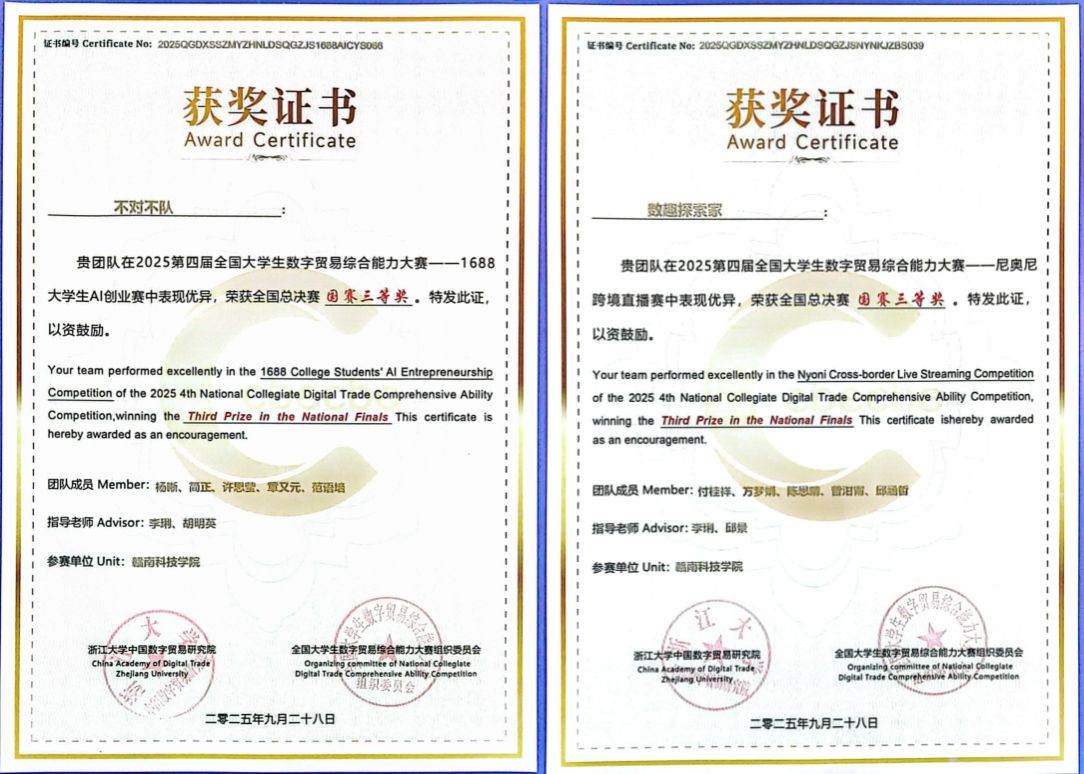本网讯:9月26日—28日,“2025年第四届全国大学生数字贸易综合能力大赛”之1688大学生AI创业赛、尼奥尼跨境直播大赛全国总决赛分别在浙江大学紫金港校区、浙江外国语学院举行。澳门十大网投正规官网李琍、胡明英两位老师指导的“不对不队”喜获国家三等奖,参赛学生由会计233班杨晰、会计233班简正、国贸242班许思莹、通信231班章又元、工商231班范语培等五位同学组成。邱景、李琍两位老师指导的“数趣探索家”团队喜获国家三等奖,参赛学生由英语232班付桂祥、方梦娟和数字经济242班陈思晴、曾泔甯、邱涵哲等五位同学组成。