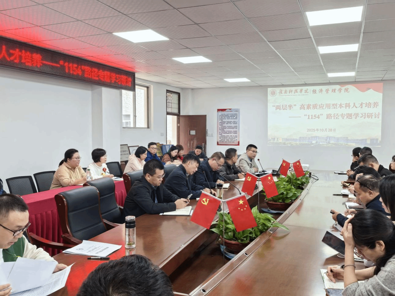 本网讯:2025年10月28日下午,澳门十大网投正规官网平台召开“两层半”高素质应用型本科人才培养—“1154”路径专题学习研讨会。学院领导班子成员、全体专任教师全员参与,会议由学院党委委员、教学负责人王波主持。
