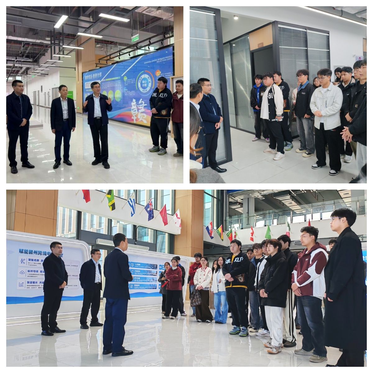 实践活动中,同学们先后走进赣州国际陆港一楼展厅、三楼跨境电商生态创新中心与赣州大学生跨境工场。在活动中,工作人员详细介绍了“教学・培训+就业+创业”三位一体的跨境电商人才孵化生态构建,跨境电商实战培训课程等方面的内容。在讲座中,韩金玉重点介绍了跨境工场0成本创业理念、在场地资金等方面的扶持及赣州综保区提供一站式陪跑服务的政策。在座谈中,学校教师与蔡湖南、韩金玉就开展跨境电商领域技术服务和人才培养合作进行了交流。