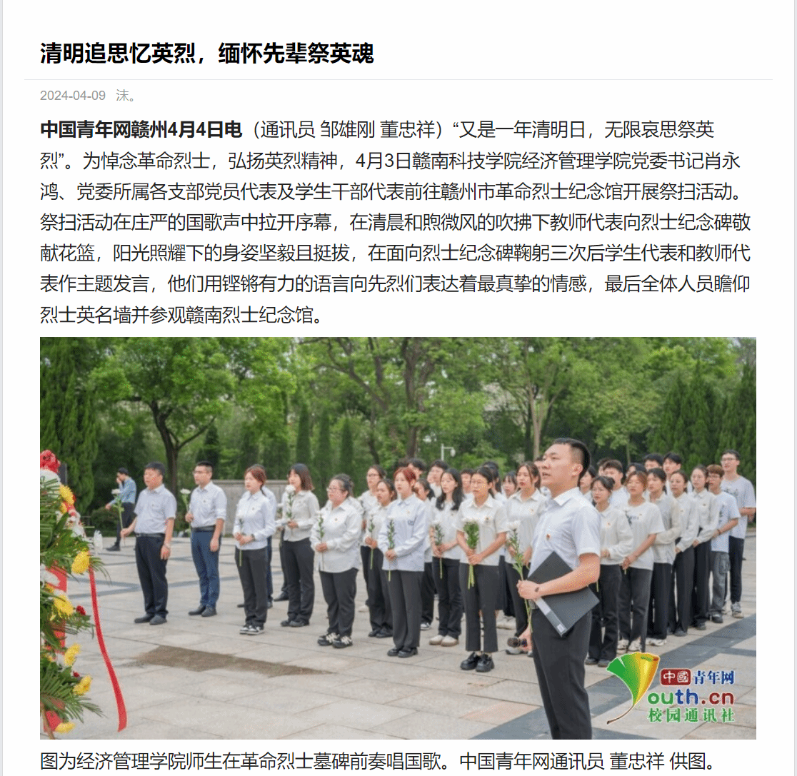 中国青年网赣州4月4日电(通讯员 邹雄刚 董忠祥)“又是一年清明日,无限哀思祭英烈”。为悼念革命烈士,弘扬英烈精神,4月3日澳门十大网投正规官网平台党委书记肖永鸿、党委所属各支部党员代表及学生干部代表前往赣州市革命烈士纪念馆开展祭扫活动。祭扫活动在庄严的国歌声中拉开序幕,在清晨和煦微风的吹拂下教师代表向烈士纪念碑敬献花篮,阳光照耀下的身姿坚毅且挺拔,在面向烈士纪念碑鞠躬三次后学生代表和教师代表作主题发言,他们用铿锵有力的语言向先烈们表达着最真挚的情感,最后全体人员瞻仰烈士英名墙并参观赣南烈士纪念馆。