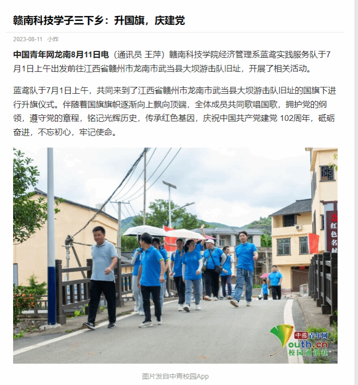 中国青年网龙南8月11日电(通讯员 王萍)澳门十大网投正规官网平台经济管理系蓝鸢实践服务队于7月1日上午出发前往江西省赣州市龙南市武当县大坝游击队旧址,开展了相关活动。