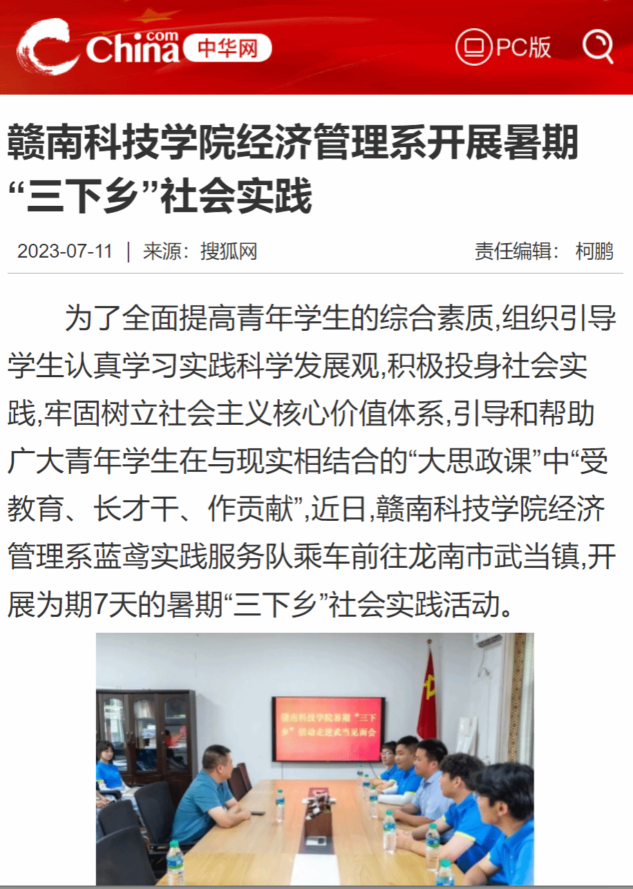 中华网7月11日载:为了全面提高青年学生的综合素质,组织引导学生认真学习实践科学发展观,积极投身社会实践,牢固树立社会主义核心价值体系,引导和帮助广大青年学生在与现实相结合的“大思政课”中“受教育、长才干、作贡献”,近日,澳门十大网投正规官网平台经济管理系蓝鸢实践服务队乘车前往龙南市武当镇,开展为期7天的暑期“三下乡”社会实践活动。