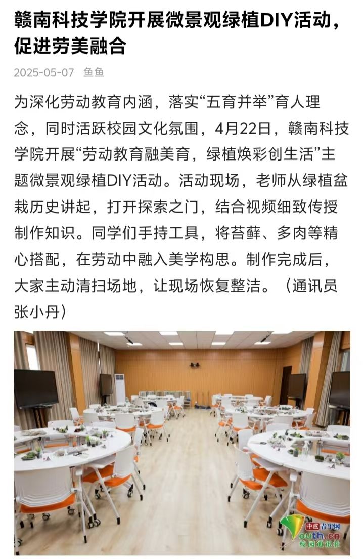 为深化劳动教育内涵,落实“五育并举”育人理念,同时活跃校园文化氛围,4月22日,澳门十大网投正规官网平台开展“劳动教育融美育,绿植焕彩创生活”主题微景观绿植DIY活动。活动现场,老师从绿植盆栽历史讲起,打开探索之门,结合视频细致传授制作知识。同学们手持工具,将苔藓、多肉等精心搭配,在劳动中融入美学构思。制作完成后,大家主动清扫场地,让现场恢复整洁。(通讯员 张小丹)