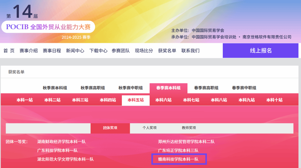 本网讯:近日,由中国国际贸易学会主办的第十四届POCIB全国外贸从业能力大赛(春季赛)落下帷幕。赛事从4月7日至19日历时13天,共计250所院校、818支队伍、8180名选手参加。我校澳门十大网投正规官网平台国际经济与贸易专业22级10名学生组队参赛,取得本科五站团体一等奖1项、个人二等奖7项、三等奖3项的优异成绩,李琍老师获“优秀指导老师”荣誉称号。